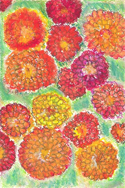 These “Zestful Zinnias” soon became an interesting “oil pastel technique” challenge for me. Take a look at it, and then I’ll explain.
