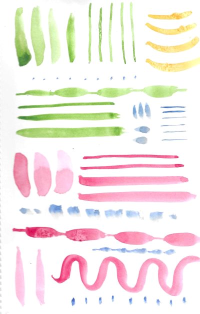 The “daily practice” I’m doing now is another class offered by Joy Ting. Like her first class, this one is also called “Color Play“, but it uses watercolor instead of oil pastels and colored pencils. So far this month we’ve looked at the supplies we’ll be using and have started doing a few practice exercises to get acquainted with our watercolors and brushes.