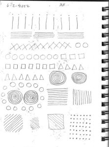 I’ve darkened this scan to make the dots more visible. You can see that I began in a very tentative way, then gradually got a bit bolder with my dots. The purpose here is to help improve hand-and-eye coordination, and ideally I would end up with a nice square composed of 49 dots — 7 rows across, 7 rows down.