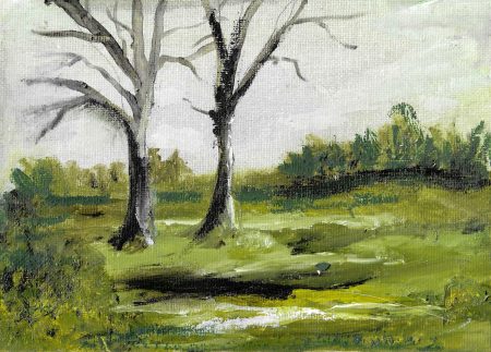 So, I grabbed an old painting. This is a little 5 x 7 canvas I’d used for a bit of tree-painting practice. I thought maybe I could use the black paint stick to darken the shadows a bit… which, I did, but not after a bit of trial and error.