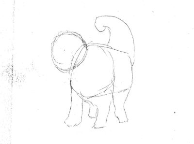 Out of curiosity, I just now picked up my sketchbook, grabbed a pencil from my desk and very quickly — about 30 seconds — drew the overall “shape” of this cat once again, this time following the structural list above. I began by drawing the rib cage area, added a line for the spine, and filled in the pelvis. This cat is standing in a foreshortened position, so I tried to adjust for that. I then added the legs, imagined the neck (which we can’t really see) and showed the placement for the skull. I did add a tail but forgot to add any ears. Here was the result.