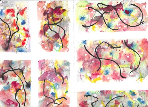 There’s a bit cut off at the bottom. My scanner won’t accommodate a full sheet of watercolor paper, but you’re not missing anything important. You can get a feel for what this colorful mixed-media abstract is all about.