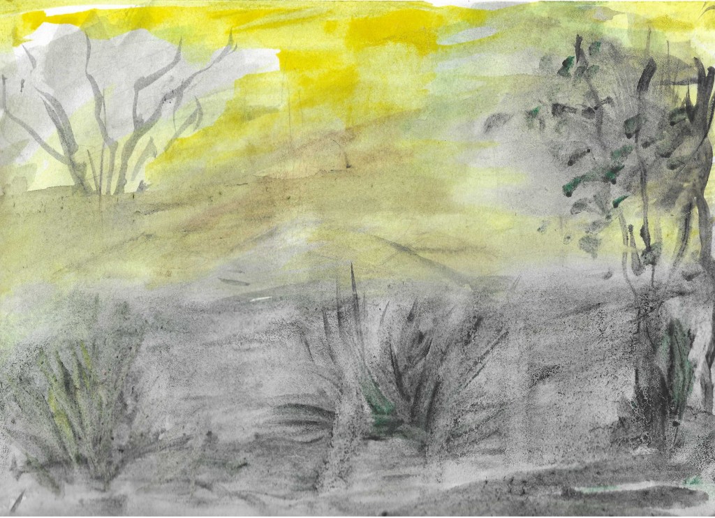 The tutorial was about painting “Morning Mist” or “Morning Fog” — about the role light plays in creating mood and atmosphere. I won’t show you the beautiful watercolor I was supposed to create. I’ll only show my result.