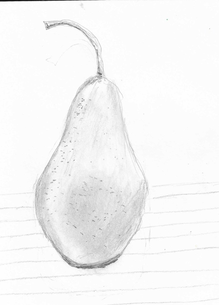 I had fun drawing this pear, and I thought about how many times in the past I’ve drawn or painted pears. Then I began browsing through the blog, going all the way back to March 2016, the month when Artistcoveries first began. A post there — What Shall I Draw Today? — featured one of my first, rather sad, attempts at watercolor. I won’t show it again here, but it was good to look back and see for myself that my art skills did, indeed, improve in time.