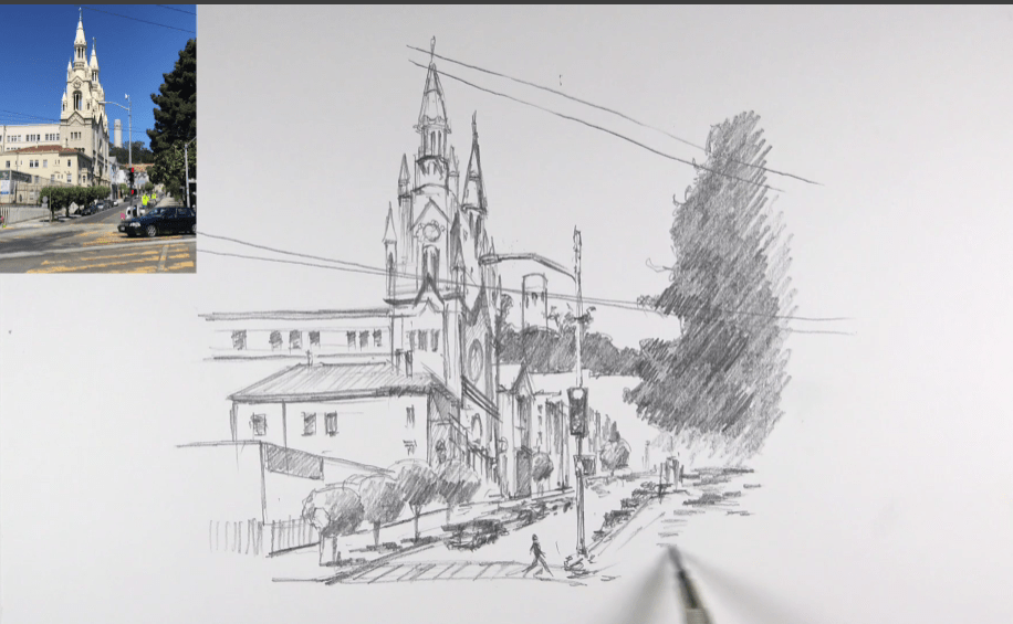 One particular video — from a graphite course at The Virtual Instructor — nearly sent me into an artistic tailspin. The lesson topic is sketching, how it differs from drawing, and why sketching can be (and should be) a good daily exercise habit for an artist. Of course, the instructor’s idea of “a quick sketch” is a lot different from mine. Take a look at this “quick sketch” he made of an urban scene.