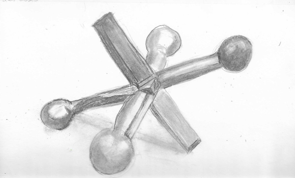 On my own, I would never have chosen a jack like this as a subject for any drawing or sketching practice. I drew it only because it was a reference for a lesson on seeing and drawing shapes. In that respect, perhaps it is a good reference photo. We can clearly see round, spherical shapes which can be drawn as circles. We can see shapes that are more or less long rectangles, and if you look closely you’ll even see a triangular shape at the center.