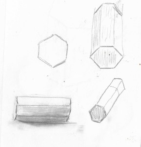 I had to count. One…two… five… six… yes, six different sides. Oh, right, it’s a hexagon! I suppose I should more correctly say that it’s “hexagonal”. The hexagon is a shape. This is a form, thus I should refer to it perhaps as a hexagonal column. Whatever it was, I immediately had doubts about drawing it.