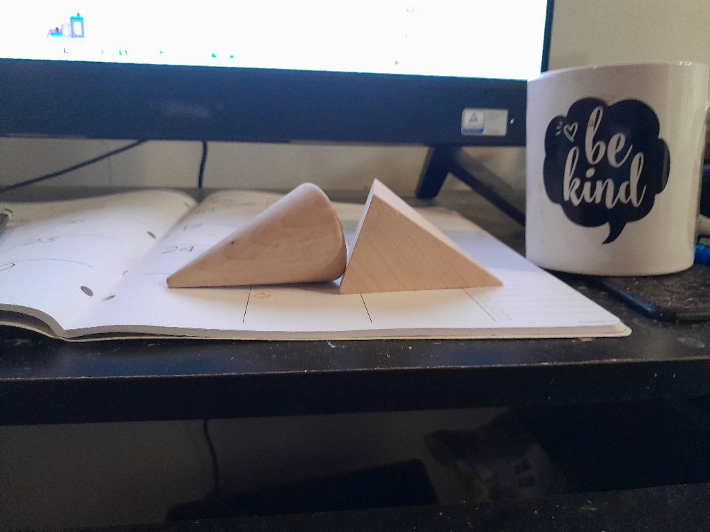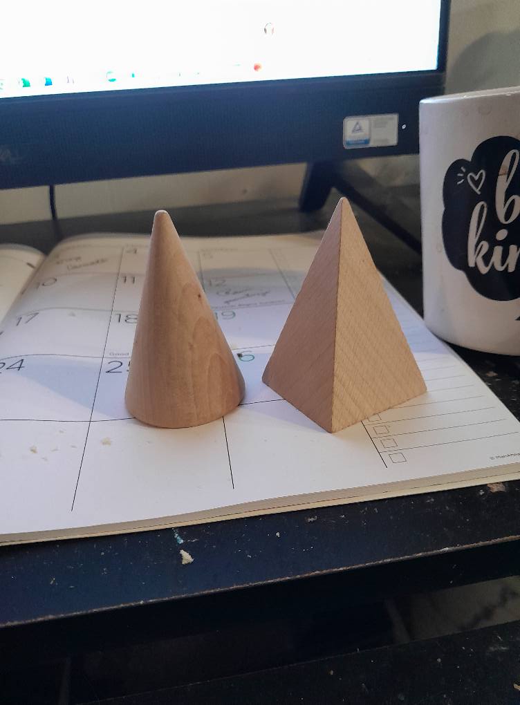 Yet I’ll give myself credit for trying. I’ll give myself credit, too, for the wood-grain texture I was able to show, both on the pyramid and on the cone. And I’ll give myself credit for taking time to measure, even the results are off.