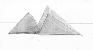 Today was one of those “challenge” days. I reached into my box of goodies and pulled out a cone and a pyramind. I could have simply placed them side by side, drawn them, and probably come away with a fairly realistic representation of these two blocks. As you can see, these two forms are approximately the same in height and width.