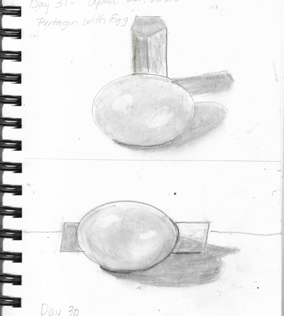 By the time I’d finished the egg, my eye was bothering me. The lines on the pyramid and truncated cone were difficult to distinguish, so I just “shaded” them the best I could and did the best I could on adding the cast shadows, as well.