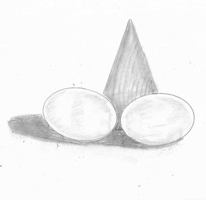 And so I dutifully arranged my set-up. Two white, wooden eggs and a cone-shaped wooden block. I took a deep breath, reached for my templates — now essential parts of my drawing toolkit — and I managed to get the basic shapes in the proper position.