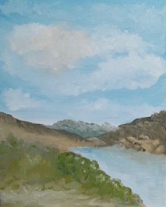 Mostly I wanted to re-do the sky a bit, and I wanted to work on colors. I wanted to make them a bit more vibrant. I still haven’t had courage enough to start the large, leafy tree I envision as part of this scene, and all in all my feelings are a bit of a “mixed bag”. Sometimes I feel like “Hey, it’s old hat. I know how to do this.” At other times I look at the canvas and think “I haven’t got a clue what to do!”