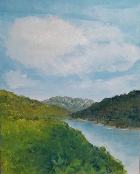 Mostly I wanted to re-do the sky a bit, and I wanted to work on colors. I wanted to make them a bit more vibrant. I still haven’t had courage enough to start the large, leafy tree I envision as part of this scene, and all in all my feelings are a bit of a “mixed bag”. Sometimes I feel like “Hey, it’s old hat. I know how to do this.” At other times I look at the canvas and think “I haven’t got a clue what to do!”