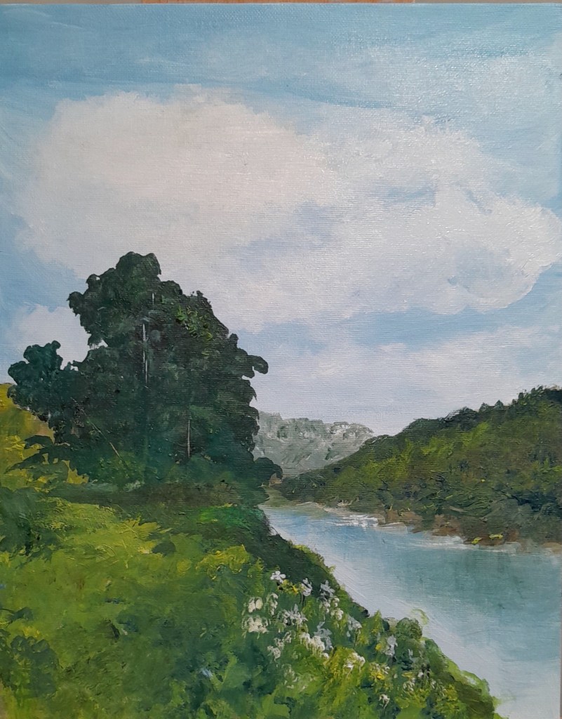 The reason for being “too busy”, you can no doubt guess, is that I was so afraid of “messing it up” and totally ruining this first attempt at painting after several years. Indeed, it was with great trepidation and shaking hands that I picked up my brushes, squeezed out some paint, and finished this “Summer Scene 2025”.