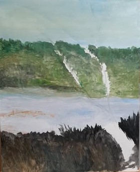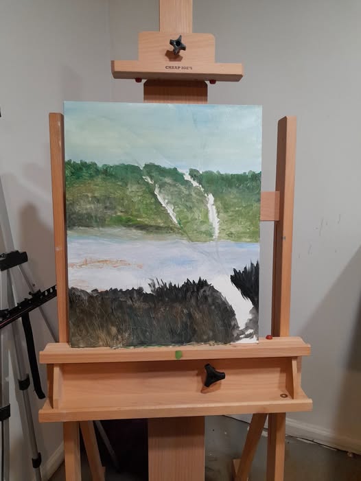 This is a larger canvas than the one I just finished. This is 16 x 20. That gives me more canvas to cover, more opportunity to practice various brushstrokes, more practice in getting proportions correct. My plans will include making the water a bit lighter in value. As mentioned before, I will be re-defining the riverbank area and adding some details.